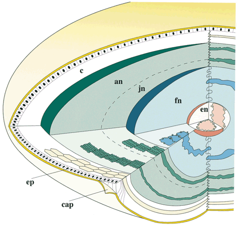 Fig. 9. Schematic scale (15:1) diagram of a 60-year-old aged noncataractous human lens. The embryonic nucleus (en) is enlarged 4× , and the epithelium (ep) and capsule (cap) are enlarged for clarity. Fibers are approximately to scale relative to each other (but not to the region thickness). The sutures are not shown. The fetal nucleus (fn), juvenile nucleus (jn), adult nucleus (an), and cortex (c) are composed of secondary fibers formed during specific periods of development and growth. (Taylor VL, Al-Ghoul KJ, Lane CW et al: Morphology of the normal human lens. Invest Ophthalmol Vis Sci 37:1396, 1996)