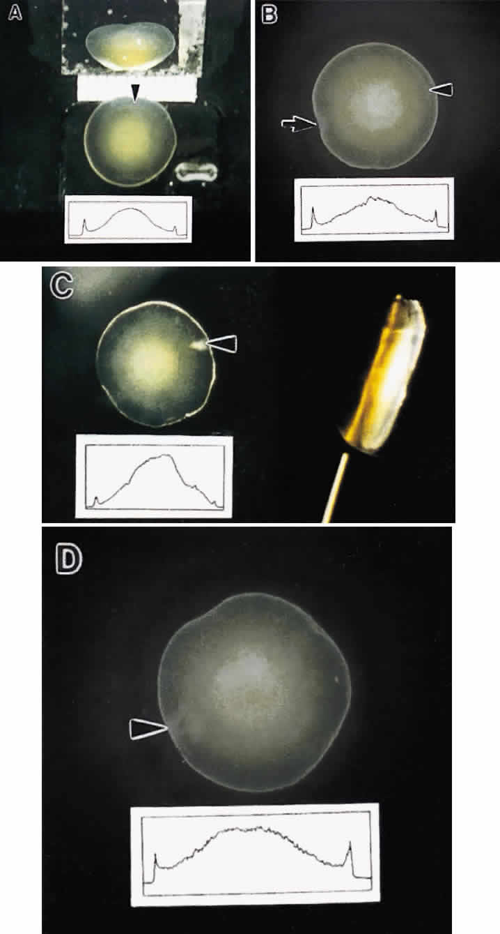 Fig. 10. Representative in vitro dark-field photomicrographs of surgically removed (intracapsular technique) age-related nuclear cataracts. Each lens has pronounced nuclear scattering and localized cortical opacities (arrowheads). The optical density scans (insets) demonstrate that the central regions of the lenses scatter the greatest amount of light. A. Anterior and side (prism) views from a 61-year-old cataractous lens. A calibration bar in millimeters is included. B. Anterior view of a 73-year-old cataractous lens with an asymmetric distribution of the whitish central scattering also indicated by the fluctuations at the apex of the density scan. The arrow indicates the probable attachment site of the cryoprobe used to extract the lens. C. Anterior (left) and in vitro slit-lamp (right) views of an 81-year-old cataractous lens. Note the markedly higher scattering from the central region corresponding to the embryonic and fetal nuclei. D. Anterior view of a 67-year-old cataractous lens with a very slight decrease in scattering at the lens center. (Al-Ghoul KJ, Lane CW, Taylor VL et al: Distribution and type of morphological damage in human nuclear age-related cataracts. Exp Eye Res 62:237, 1996)