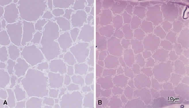 Fig. 11. Light micrographs of embryonic nuclear fiber cross-sectional profiles from a normal transparent 59-year-old lens (A) and from a nuclear cataractous 81-year-old lens (B). At this magnification, the morphology of normal and cataractous embryonic fibers essentially is indistinguishable.