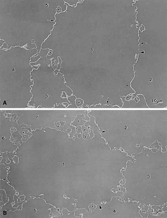 Fig. 12. Transmission electron micrographs of embryonic nuclear fiber cross-sectional profiles from an aged transparent 62-year-old lens (A) and a nuclear cataractous 83-year-old lens (B). In several numbered fibers, gap junctions (space indicated by arrowheads), undulating membrane pairs (arrows), and interlocking edge processes (circular profiles marked with asterisks) are apparent. Cataractous embryonic nuclear fibers have quantifiably more numerous edge processes (asterisks) than aged embryonic nuclear fibers. (A, Al-Ghoul KJ, Costello MJ: Fiber cell morphology and cytoplasmic texture in cataractous and normal human lens nuclei. Curr Eye Res 15:533, 1996; B, Al-Ghoul KJ, Lane CW, Taylor VL et al: Distribution and type of morphological damage in human nuclear age-related cataracts. Exp Eye Res 62:237, 1996)