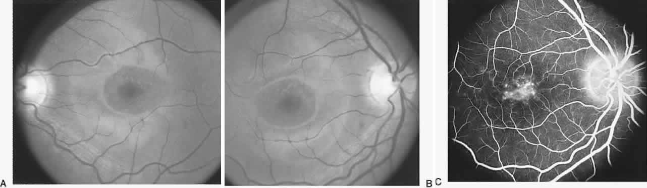 by an episode of cervical myelopathy. Acute multifocal retinitis, another idiopathic inflammation in eyes of healthy young to middle-aged adults, may be associated with optic disc edema and may follow flulike prodromes.24 Mild vitrous reaction and macular exudative stars are characteristic, and a self-limited benign outcome is usual, with no evidence of specific infectious or autoimmune causes. Other relatively acute multifocal chorioretinal inflammations include presumed ocular histoplasmosis, coccidioidomycosis, Pneumocystis carinii infection, cryptococcosis, mycobacterial or syphilitic choroiditis, birdshot (vitiliginous) retinochoroidopathy, punctate inner choroidopathy, and acute multifocal posterior placoid pigment epitheliopathy (AMPPPE). Although specific infectious agents may also be incriminated in meningeal reactions, such as cryptococcosis, AMPPPE is associated with CSF pleocytosis and protein elevation, findings suggesting possible viremia.25 The foregoing discussion has focused on retinal pigmentary and macular disease in relation to neurologic disorders, not simple isolated macular dystrophies, which are considered at length elsewhere.23,26 |