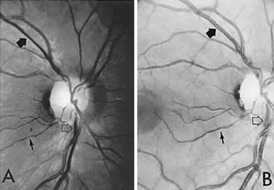 The retinal variety may be admixed in a person who suffers the more conventional attacks of migraine. It is presumed that vasospasm in the retinal circulation determines transient hypoxia, perhaps somewhat similar to the visual cortical event. On rare occasions, the fundus has been examined during typical retinal migraine episodes, and arterial constriction has been described. Wolter and Burchfield106 photographically documented such an episode and demonstrated mild “retinal edema”; vessel narrowing is also evident (Fig. 8). Fortunately, permanent complications of retinal migraine are rare. These may take the form of central retinal artery occlusion or ischemic papillopathy (see Volume 2, Chapter 16); nerve fiber bundle visual field defects may be demonstrated (Fig. 9). |