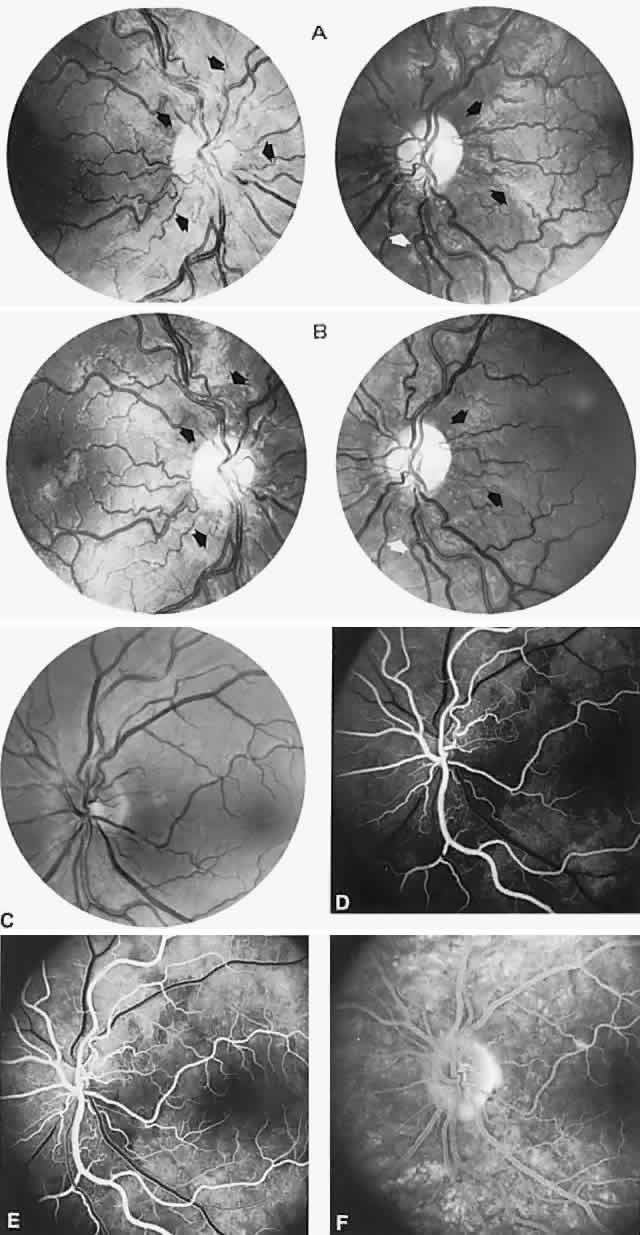 coagulopathy. When disc swelling seems disproportionate to other hemorrhagic features, the vague term “papillophlebitis” is clinically applied, admittedly with little or no evidence of actual inflammatory disease. Although the course may be protracted (up to 18 months), the outcome is benign and apparently is unaltered by corticosteroid therapy. In a series of 40 patients with this diagnostic rubric,107 some 7 cases of mitral valve prolapse were found, and 8 of 23 patients studied hematologically showed an increase in platelet coagulant activity concerned with the initiation of early stages of intrinsic coagulation. Nine patients had macular edema that contributed to lowered acuity, at times worse than 20/200, and “all patients had a fluorescein angiogram that was consistent with a central retinal vein occlusion of the nonischemic type.” So-called papillophlebitis may be associated with retinal arterial occlusions and may possibly represent a form of idiopathic vasculitis or a coagulation defect of pregnancy.108 In contrast to this benign form of papillary or retinal “vasculitis,” Cogan109 documented a “severe vasculitis” category, including cases of periarteritis nodosa, Behçet's disease, multiple sclerosis, and granulomatous vasculitis. The cause in patients without systemic disease is speculative, but Cogan demonstrated in his patients with “severe vasculitis” that there was round cell infiltration of the venular walls. The question of retinal arteritis, vasculitis, and autoimmune mechanisms was admirably reviewed by M. D. Sanders,110 who presented clinical information on 150 cases examined at St. Thomas' Hospital, London. Retinal vasculitis should be considered when inflammatory changes (focal or extensive sheathing or occlusion of vessels; retinal infiltrates and hemorrhages; cellular debris in vitreous; vascular leakage of fluorescein) occur in relation to retinal vessels. Diagnostic categories include the following: infectious (tuberculosis, syphilis, herpes simplex, cytomegalovirus [CMV]); multiple sclerosis with phlebitis; polyarteritis nodosa, lupus erythematosus, Wegener's and Goodpasture's syndromes, sarcoidosis, Behçet's disease; autoimmune vasculitis without systemic disease, polymyositis, dermatomyositis, polyarteritis nodosa, Whipple's disease, and ulcerative colitis. Despite these purported associations, in well patients with primary retinal vasculitis and no medical history suggestive of underlying systemic disease, results of diagnostic batteries are meager, and follow-up data do not suggest subsequent manifestations of specific causes.111 Although it is admittedly unrewarding, minimal evaluation would include complete blood count, ESR, urinalysis, fluorescent treponemal antibody absorption test, rapid plasma reagent, and chest roentgenogram.111 Retinal vasculitis exceptionally is associated with CNS vasculitis (angiitis). In 1882, Eales described a variety of retinal periphlebitis characterized by “retinal hemorrhage associated with epistaxis and constipation” seen in young men in southern England. Patients present with recurrent, usually monocular, vitreous hemorrhages that may persist for years and ultimately involve the second eye. Neurologic complications must be rare, but subacute myelopathies, chronic lymphocytic meningitis, and middle cerebral artery stroke have been reported.112 Distinction from the retinal vasculitides discussed above is problematic, and “Eales' disease” remains a diagnosis of exclusion. Microangiopathy of the brain, retina, and inner ear (Susac's syndrome) is a rare disorder predominantly affecting women of child-bearing age, but without a specific origin or systemic manifestations. An immune or coagulopathic background is unproved. Patients present with the following: vision loss due to branch retinal arteriolar occlusions with vessel hyperfluorescence on fluorescein angiography, and delayed leakage; hearing loss; multiple CNS infarctions.113 Efficacy of treatment with corticosteroids and immunosuppressive agents is uncertain, but hyperbaric oxygenation has been beneficial in a single case, with rapid visual improvement.114 Other infrequent causes of multifocal segmental retinal vasculitis, co-mingled with neuroretinitis and choroiditis, include Lyme disease,115 Rochalimaea infection (cat-scratch disease),116 and intraocular lymphoma.117 Without neurologic or systemic implications, a syndrome of retinal vasculitis, with aneurysmal dilatation of arterioles, capillary nonperfusion, and exudative neuroretinitis with marked decrease in acuity, has been described, with an age range of 9 to 49 years and a female preponderance; oral corticosteroids had no beneficial effects.118 Ten patients with isolated retinal vasculitis with family history of multiple sclerosis, or positive HLA-B7 typing, underwent MRI, which showed white matter lesions resembling those of multiple sclerosis in 3 instances, suggesting a causative relationship.119 |