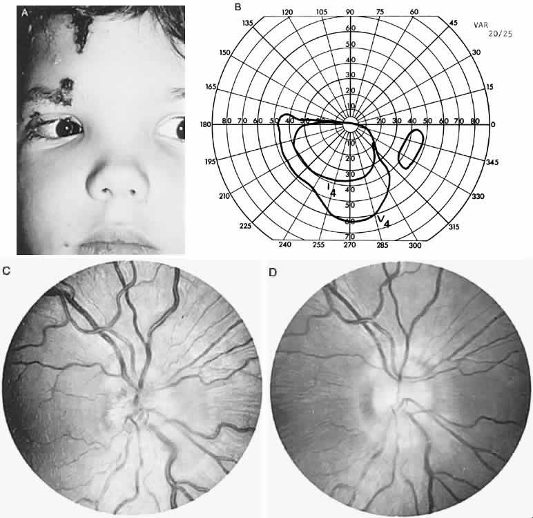Optic neuritis may accompany acute or chronic meningitis in children or adults. Purulent leptomeningitis spreads to involve the optic nerve sheaths, primarily in the optic canal, or the substance of the nerve itself. Disc swelling may be present. Optic atrophy can follow severe neuritis, but as a rule, vision returns to functional levels, even after several months. In cases complicated by hydrocephalus or opticochiasmatic arachnoiditis, field loss may be progressive. The optic nerves may also be involved in focal basal granulomas260 or diffuse granulomatous or infectious meningitis, including fungal infections such as cryptococcosis,261 syphilis, and tuberculosis (Fig. 34). The therapy is that of the primary infectious process, but ultimate visual outcome is guarded. As noted, optic neuritis is not rare in the viral disorders of childhood, which may be associated with symptomatic or asymptomatic meningoencephalitis. As a rule, bilateral disc swelling is seen, resulting from either papilledema or optic neuritis. Both viral and bacterial meningitis may cause visual complications that fall into three anatomic categories: (1) papillitis, retro-bulbar interstitial, or perineuritis (leptomeningitis); (2) cortical blindness (usually with cortical venous thromboses); and (3) progressive optic atrophy as a result of opticochiasmatic arachnoiditis or hydrocephalus. On rare occasions, herpes zoster ophthalmicus, the trigeminal dermatologic reactivation of varicella-zoster virus (human herpes virus-3), may be associated with optic neuritis, either in the retro-bulbar form or with a severe ischemic papillitis. In immune-compromised patients, varicella-zoster optic neuropathy may precede retinal necrosis,262 or it is more usually delayed.263 The efficacy of acyclovir and corticosteroids is variable. With perineuritis and perivasculitis as pathologic substrate, poor visual outcome is the rule, from which the following case is an extraordinary exception: