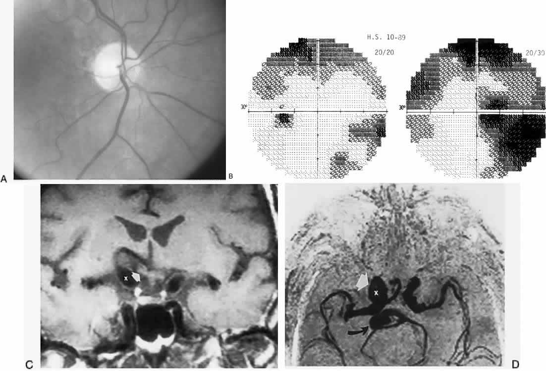 optic neuropathies. Conversely, progressive visual defects may be attributed to “glaucoma” when no such condition exists. Here, the interpretation of visual field defects is critical, and the judicious use of radiologic studies is mandatory. Greenfield et al388 found that only 2 of 31 patients diagnosed initially with glaucoma had neuroradiologic evidence of mass lesions, and in both instances other neuro-ophthalmic signs had been overlooked, including optic disc neural rim pallor. Defects that preferentially involve the nasal field, but without a hemianopic character (aligned on the vertical meridian) are most likely due to glaucoma or ION. Bilateral nasal field defects that are truly hemianopic must be extraordinarily rare. Otherwise, binasal defects may be associated with chronic papilledema or hyaline bodies of the nerve head, either of which should be discernible by ophthalmoscopy. |
