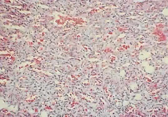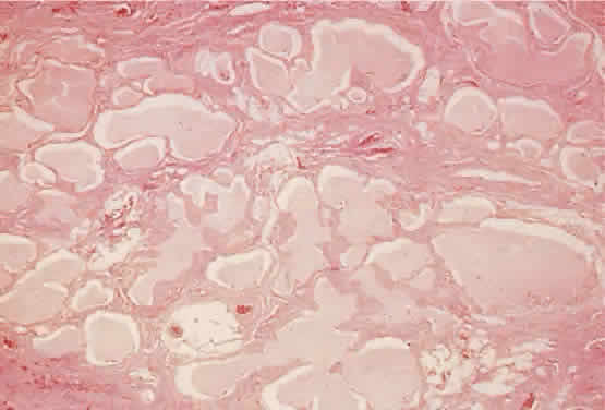 A conservative approach to therapy is favored, because the majority of lesions regress spontaneously. However, irreversible functional and cosmetic changes may occur while the tumor is present. Haik and colleagues65 noted an 80% complication rate, which included residual proptosis, ptosis, strabismus, skin abnormalities, and a 60% incidence of amblyopia. Amblyopia results more commonly from anisometropia than from stimulus deprivation.70,71 Upper eyelid lesions are more responsible for amblyopia than lower lid lesions, with the axis of the correcting plus cylinder pointing toward the lesion.66 The indications for treatment include threatened or established amblyopia and massive proptosis that may be compromising visual function by optic nerve compression or corneal exposure. There are several treatment methods available for capillary hemangioma; however, the risk/benefit ratio and suitability of each method for each patient must be considered.62 No single treatment is appropriate for all. Corticosteroids may sensitize terminal vascularbeds to circulating catecholamines, leading to constriction, sluggish flow, and coagulation.72,73 Steroids can be administered orally in the form of prednisone, 2 to 4 mg/kg/day. The major risks are adrenal suppression and growth retardation, and treatment should be directed by the infant's pediatrician. Intralesional corticosteroid injection has been used often, with generally good results.71,74 Treatment consists of triamcinolone 1 ml (40 mg/ml) and betamethasone 1 ml (6 mg/ml). Although this route is designed to avoid systemic complications, cases of adrenal suppression have been documented.75,76 Of additional concern are rare embolic complications, including ipsilateral and bilateral vision loss.77,78 When the tumor's histology (see Fig. 10) and hemodynamic continuity are considered, it would seem that any intralesional injection is, to some degree, an intravascular one, regardless of needle size. However, retrograde arterial embolization might be avoidable by limiting injection force. Corticosteroids can be administered topically to relatively superficial hemangiomas in the form of clobetasol propionate cream, 0.05%.79,80 Some systemic absorption should be anticipated. Among lasers in current use, the Candela dye laser may be the most selective for these vascular lesions. However, penetration is limited, and its utility may be restricted to superficial, bright red tumors. Interferon-α-2A (1 to 3 million units/m2/day) generally has been reserved for lesions that are life- or sight-threatening or cause severe facial distortion.81 Significant risks include bone marrow suppression, liver damage, and neurotoxicity. Deans and associates82 described surgical dissection for carefully selected cases. Tumors must be relatively circumscribed and deep enough that a surgical plane can be developed without causing necrosis of overlying tissues. To minimize the risk of hemorrhage, the entire surface of the lesion must be dissected, with pinpoint bipolar cautery of draining veins and feeding arteries. Direct incisions into the lesion are avoided. LYMPHANGIOMA A lymphangioma consists of an interanastomosing network of channels that are each defined by thin septa lined by endothelial cells (Fig. 11). The lumens contain proteinaceous material that probably represents local transudation. This fluid has the appearance, if not the physiologic function, of lymph. The designation of these lesions as lymphatic malformations also derives from the variable presence of lymphoid follicles. Conflicts of terminology regarding developmental vascular malformations of the orbit, particularly lymphangiomas and primary varices, have largely derived from strict histopathologic definitions. As a step toward uniform nomenclature, a classification based on hemodynamic relationships has been recommended.63,83,84 The septa of a lymphangioma do contain small nutrient arteries and veins, but there is little communication between the systemic circulation and the actual channels of the tumor. Neither arteriography nor venography causes filling of these spaces, and increases in orbital venous pressure, as with crying, do not cause the twofold to threefold increases in size observed with orbital varices. The fragility of the septa, with their intrinsic vascular supply, may explain the characteristic hemorrhages that occur in lymphangiomas. Bleeding into a lumen may produce a single hemorrhagic cyst or a mass that is multilobulated because of the intercommunication of vascular channels (Fig. 12). The sparse stroma allows dramatic expansion of blood cysts. Unlike capillary hemangiomas, lymphangiomas have a stable population of endothelial cells.61 Proliferation does not exceed the rate of overall body growth, and enlargement of the basic lesion ceases after adolescence. Regression does not occur. However, proptosis may be intermittent and variable because of recurrent intrinsic hemorrhage and blood resorption. Variations in proptosis may parallel upper respiratory tract infections and are attributed to lymphoid hyperplasia in response to immune challenge.85 A history of such variation often cannot be elicited, however. Although all orbital lymphangiomas are probably congenital, they often do not become clinically manifest until the first hemorrhagic episode (Fig. 13). Most orbital cases are apparent within the first decade of life, with an average age of presentation of 6 years.86