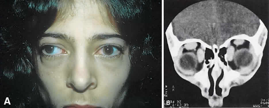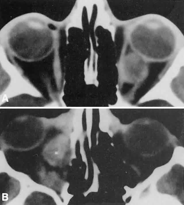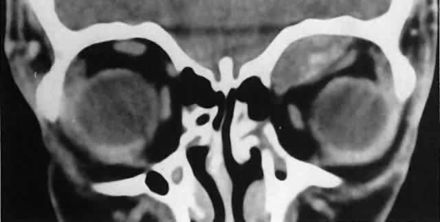 The general management of these disorders varies widely. In most of the malignant conditions, a prompt tissue diagnosis is followed by systemic evaluation and definitive multimodal therapy by a team skilled in pediatric oncology. In these cases, the preferred surgical approach for the biopsy may vary with the suspected tumor. For a lymphangioma with recent hemorrhage, the diagnosis might be established on clinical grounds and the patient observed, or intervention might be restricted to simple evacuation of blood cysts without attempts at major resection. For a dermoid cyst, complete excision without violation of the tumor capsule is the goal. For a capillary hemangioma, the clinical diagnosis generally is followed by simple observation without surgical intervention. In inflammatory processes, the diagnosis also is based on clinical evidence, and anti-inflammatory measures are initiated. Distinctions between infectious and idiopathic inflammations are necessary in choosing the appropriate medications. Although these conditions are addressed individually elsewhere in this text, they are presented briefly and in juxtaposition here, because it is apparent that some informed distinctions must be made promptly at the time of initial presentation. Although we briefly discuss treatment, the emphasis of this chapter is on the features that might lead to a provisional diagnosis. There are marked differences in the frequency of these disorders,1 but they do not reflect the clinical importance of any individual lesion. Statistical frequencies are also of less value in the diagnosis of any individual case than are careful analysis of the history, physical findings, imaging tests, and histopathologic samples. Computed tomography (CT) remains the first-line diagnostic test in most cases of proptosis. The topographic features shown by CT should narrow the differential diagnosis. Magnetic resonance imaging (MRI) can provide additional diagnostic information by exploiting different physical properties of the lesion compared with CT. For example, lesions that are isodense with normal structures by CT may not be isointense by MRI. In selected cases, orbital echography may further reduce the diagnostic choices by providing information about the lesion's internal architecture. |