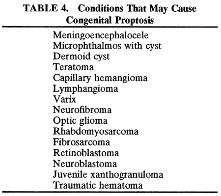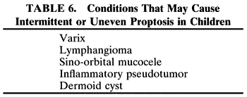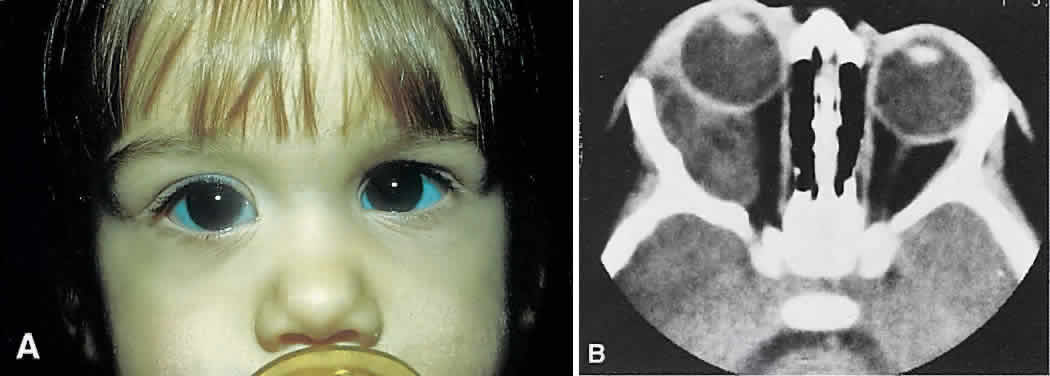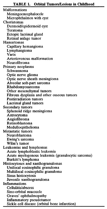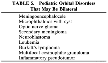 benign in every sense. The full differential diagnosis of pediatric proptosis is a broad one, although the causes are relatively distinct from those in adults (Table 1). The list of conditions that may produce sudden or rapidly progressive proptosis is considerably shorter, but a diverse group of disorders must still be considered in this clinical setting (Table 2). Some of these conditions originate in and are restricted to the orbit. They may result from disordered embryogenesis and development, or they may arise as primary neoplasms. In the pediatric population, tumors that metastasize from distant primary sites preferentially lodge within the orbit rather than within the globe, a reversal of the tendency noted in adults. Proptosis also may result from orbital involvement by systemic conditions such as leukemia and the histiocytoses. Orbital manifestations of these disorders may be the presenting clinical signs. Finally, orbital inflammatory conditions can simulate true neoplasia and may have to be considered in the differential diagnosis in individual cases.