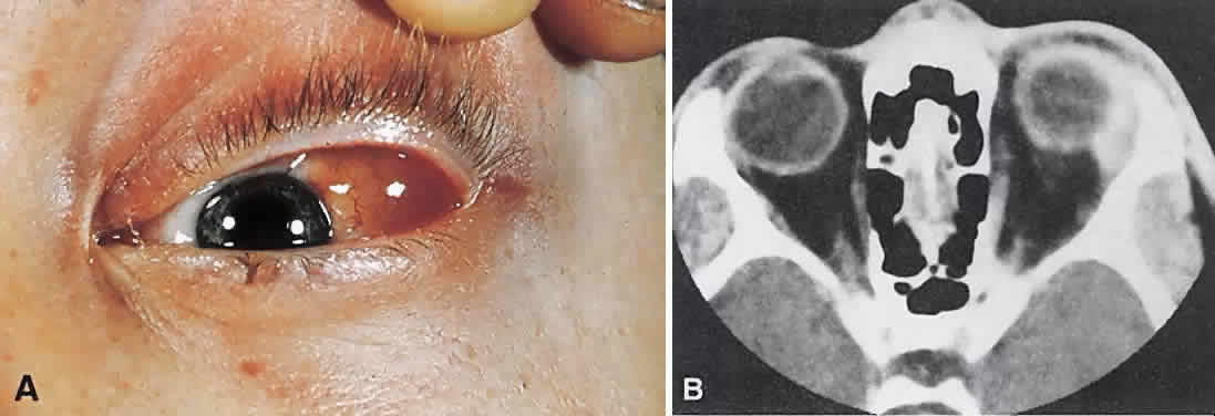 In dacryoadenitis, external inflammatory signs are localized to the superotemporal quadrant, and CT shows enlargement of the lacrimal gland (Fig. 24). Lacrimal gland inflammation may be bacterial, viral, or a variant of IIPT. It is possible, however, that many cases of “idiopathic” dacryoadenitis represent unidentified viral infections. In bacterial dacryoadenitis, a leukocytosis with a left shift may be present.96 In questionable cases, a 1-week course of oral antibiotics can be administered to these patients. Among children, the probability that an enlarged lacrimal gland represents neoplasia rather than inflammation is lower than among adults, although epithelial lacrimal gland tumors occasionally may occur in the pediatric population and can produce external inflammatory signs. If the general signs and symptoms of IIPT are lacking, a biopsy should be performed. Histopathologically, IIPT is characterized by a sparse, mixed inflammatory cell infiltration of the tissues primarily involved (i.e., extraocular muscle, lacrimal gland, Tenon's fascia). The predominant cell is a mature lymphocyte, but there are significant numbers of polymorphonuclear neutrophils, plasma cells, and eosinophils.95 As the inflammatory process evolves, fibrosis becomes a prominent feature. In the variant of IIPT termed sclerosing pseudotumor, collagen deposition is an early finding, and the fibroblast may be the primary mediator of the inflammatory process rather than the lymphocyte.97,98 If the histopathologic findings include true vasculitis (i.e., destruction of vessel wall intima and muscularis) or granulomatous inflammation (i.e., epithelioid and giant cells), Wegener's granulomatosis and other systemic diseases should be excluded. By definition, if a systemic process is confirmed, the IIPT designation no longer applies. If the microscopic picture is dominated by a highly cellular population of uniform lymphocytes, the spectrum of reactive and neoplastic lymphoid lesions should be suspected rather than IIPT. IIPT usually shows a dramatic response to high doses of oral corticosteroids. Clinical improvement occurs within several days, but treatment should be tapered slowly to prevent recrudescence of the inflammation. A pediatrician should collaborate in the treatment of young children with corticosteroids because of the risks of growth retardation and other complications. Although the etiology remains unknown, this exquisite treatment response adds credence to an immunologic basis. Patients tend to follow one of three long-term clinical patterns: single unilateral episodes; recurrent unilateral episodes; or recurrent bilateral episodes, usually alternating from one orbit to the other.94 Among children with IIPT, bilateral involvement and an anterior uveal component prognosticate a more severe course in terms of multiple recurrences and permanent vision loss. Sclerosing pseudotumor, which may involve a distinctly different pathogenesis, generally carries a poorer prognosis with a higher likelihood of cicatricial entrapment of orbital structures.97 Early aggressive treatment with corticosteroids is indicated.Surgical debulking may be necessary, and immunosuppressive agents may be needed in refractory cases. ORBITAL CELLULITIS Orbital cellulitis and its variants are the most common causes of rapidly progressive proptosis in childhood. The term orbital cellulitis often is applied broadly to an anatomic spectrum of bacterial infection, including preseptal cellulitis, diffuse orbital cellulitis, subperiosteal abscess (SPA), intraorbital abscess and, in rare complicated or neglected cases, cavernous sinus thrombosis. In children, possible etiologies include penetrating trauma, extension of local periocular infection (e.g., impetigo or dacryocystitis), and hematogenous seeding from a distant site (e.g., otitis media).99 However, orbital cellulitis most often results from bacterial infection of the paranasal sinuses, which share insubstantial bony walls and an extensive valveless venous system with the orbits.59,100 The clinical profile includes eyelid edema and erythema. If there is true orbital involvement, there may be proptosis, chemosis, and diminished motility. Diagnosis is aided by a history of antecedent respiratory tract infection and signs of systemic toxicity, including fever and leukocytosis. The CT findings of sinus opacification and an orbital abnormality suggest the diagnosis. However, rhabdomyosarcomas and neuroblastomas may affect the orbits and sinuses simultaneously. In these cases, destructive bone change might be expected. The initial recognition of orbital infection generally is not problematic. However, appropriate management requires other early determinations, including proper staging and risk assessment. If CT scans show only preseptal or orbital cellulitis, the prompt administration of appropriate intravenous antibiotics to these well-perfused tissues should be curative. If, however, infection is sequestered in the relatively avascular subperiosteal space (Fig. 25), concerns are raised about achieving therapeutic drug levels.59 An SPA also may have visual implications. The rapid accumulation and extension of purulent material within this potential space can increase orbital pressure, compromising optic nerve or retinal perfusion. There also are well-documented age-related variations in both the bacteriology and clinical response of the SPA/sinusitis complex.101,102 Children younger than 9 years of age are more likely to improve without surgical drainage of the sinuses or orbit, to have negative cultures if drained, or to have cultures positive for single aer-obes if drained within the first 3 days of treatment. Patients 15 years of age or older are more likely to have refractory infections, with positive cultures after more than 3 days of antibiotics usually effective in vitro, and to harbor multiple pathogens, including mixed aerobes and anaerobes. The 9- to 14-year-old age group shows