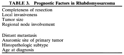 RHABDOMYOSARCOMA Rhabdomyosarcoma is the most common soft-tissue sarcoma in patients younger than 15 years of age and the most common primary orbital malignancy in childhood. These facts should not imply its frequent occurrence. Including all body sites, the annual incidence of childhood rhabdomyosarcoma in the United States is approximately 225 cases.2 The orbit is the site of origin in 5% to 25% of cases.3,4 However, site distribution varies with age. In children 5 to 9 years of age, for example, approximately 40% of primary rhabdomyosarcomas involve the orbit or eyelid.2 Although relatively rare, the tumor has a devastating natural history and demands a high index of suspicion in all cases of pediatric proptosis. Orbital rhabdomyosarcomas are slightly more common in females, with a 0.79 to 1 male-to-female ratio.2 The average age of presentation is 7.8 years, but the tumor may be present at birth and has been reported in patients as old as 78 years.5 A positive family history and associated anomalies have at times been identified, but these are exceptions rather than the rule. Classically, orbital rhabdomyosarcoma presents in an abrupt manner, with rapid progression of proptosis over days to weeks. A somewhat more indolent course does not exclude the diagnosis, however. Vigilance also should be exercised when rapidly expanding eyelid lesions are encountered. Rhabdomyosarcoma may present as ptosis or an eyelid mass rather than with proptosis.4 An eyelid rhabdomyosarcoma can occur as a congenital lesion.6 Within the orbit, rhabdomyosarcoma occurs most often, but not exclusively, in the superior nasal quadrant, with downward and outward displacement of the globe. CT scans show the topography of the orbital mass (Fig. 1A), as well as the possible extension into adjacent bone, paranasal sinuses, or the intracranial cavity. The circumscription that may be noted on CT is relative, because the lesion is not encapsulated and microscopically infiltrates normal tissue. Echography shows internal echoes of low-to-medium amplitude. Because the cellular tumor absorbs acoustic energy, the amplitude of the spikes falls off somewhat through the lesion (see Fig. 1B and C). MRI can help define the tumor's relationship to extraocular muscles (Fig. 2). The clinical diagnosis must be confirmed by biopsy. Because of the risk of seeding the biopsy tract, a transcranial approach should be avoided. If possible, the periosteum should not be violated because it presents a relative barrier to tumor invasion. Depending on its location, the lesion should be approached transconjunctivally or with an eyelid crease incision/transseptal dissection. The surgeon must balance the benefit of complete gross tumor resection with the risks of functional impairment and tumor dissemination that may accompany that effort. Tissue samples should be fixed in formaldehyde solution and glutaraldehyde for light and electron microscopic study. In addition, the value of immunohistochemical differentiation has been established for some time, and the potential uses of molecular genetic studies are rapidly emerging. Consequently, the procurement of fresh or frozen tissue, or both, has been given the highest priority by the Biopathology Discipline within the Intergroup Rhabdomyosarcoma Study Group (IRSG).2 These techniques can facilitate the diagnosis of poorly differentiated tumors, and they may refine diagnostic and prognostic classifications, identify candidate genes, and contribute to potential gene therapies. Since the inception of IRSG-I in 1972, the multicenter collaboration has enrolled the overwhelming majority of patients diagnosed with rhabdomyosarcoma in the United States and has contributed significantly to enhanced patient survival. Patients with orbital tumors had a 96% versus 83% failure-free survival in IRSG-IV compared with those in the IRSG-III.2 As of the year 2000, with the IRSG-V study underway, the overall (all primary sites) 5-year survival of children and adolescents with nonmetastatic and metastatic tumors was approaching 80%. This progress reflects advances in diagnostic imaging and multimodal treatment, including chemotherapy (e.g., agents, combinations, timing), radiation therapy (e.g., doses, fractionation, timing), and surgery (e.g., diagnostic biopsy, local staging, salvage procedures). Therapeutic protocols have evolved over the past 30 years, but they also have not been uniform at any given point in time. Rather, they have been tailored to the patient's level of risk, as determined by multiple prognostic factors (Table 3). The concept of “risk-appropriate therapy”7 recognizes, for example, that a 6-year-old child with an embryonal rhabdomyosarcoma confined to the orbit might do well with a relatively simple chemotherapy protocol, avoiding the late adverse effects of high-dose radiation. Conversely, an 18-year-old patient with an alveolar rhabdomyosarcoma arising in the retroperitoneum, with metastases at presentation, needs aggressive, complex chemotherapy and radiation, and may still do poorly. Prognostic factors considered by the multidisciplinary team include the presence of gross or microscopic residual tumor, and this determination currently is being redefined with molecular techniques that may show residual disease even without microscopic evidence2; whether tumor is confined to the anatomic site of origin or invades surrounding tissues; tumor size, with 5 cm considered a breakpoint; regional lymph node involvement; and distant metastasis. Body site plays a role, and the orbit is relatively favored. The age of the patient at diagnosis is a strong independent predictor of outcome.7 The current pathologic classification for childhood rhabdomyosarcomas by prognosis2 is as follows: