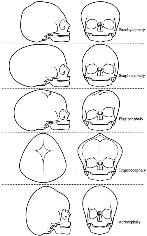and extracellular matrix component expression.7 The phenotypic pattern of deformity is a direct result of the sutures involved (Fig. 5). Scaphocephaly is an elongated, narrow cranium associated with premature fusion of the sagittal suture. Brachycephaly is a short, wide cranial vault associated with bilateral coronal synostosis. Plagiocephaly results from premature closure of one coronal suture, leading to prominent orbital asymmetry (Fig. 6). A flattened, recessed forehead occurs on the affected side, and persistent growth of the contralateral side results in frontal bossing, inferolateral orbital dystopia, and a prominent occiput. This deformity is reminiscent of hemifacial microsomia. Trigonocephaly is a triangular deformity of the anterior cranial fossa that results in medial displacement of the orbits (hypotelorism) (Fig. 7). Acrocephaly results from multiple suture closure, including bicoronal synostosis. Typically, there is excessive skull height and a pointed head.
