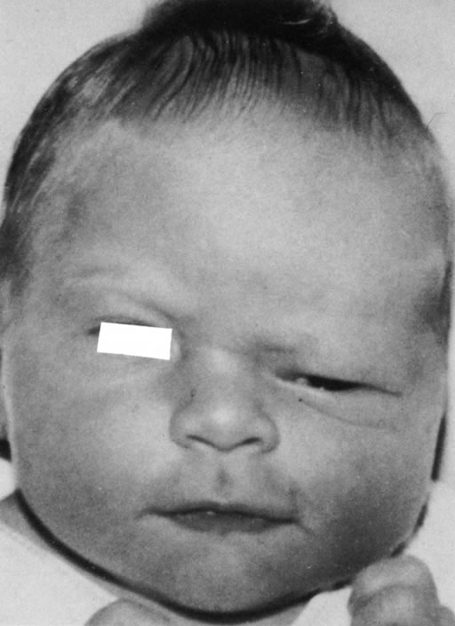 to any surgical intervention. MICROPHTHALMOS AND ANOPHTHALMOS True anophthalmos is a rare condition that results from failure of development or complete regression of the optic vesicle. This condition may be clinically indistinguishable from severe microphthalmos, which results from incomplete invagination of the optic vesicle or closure of the embryonic fissure. The term clinical anophthalmos has been used to describe patients who have no clinical or radiographic evidence of any ocular remnant, although true anophthalmos can only be verified after careful histologic sectioning of the orbital tissues. Anophthalmos and microphthalmos are usually unilateral and may be associated with a variety of craniofacial and systemic anomalies, including orbital hypoplasia, facial clefts, basal encephalocele, hemifacial microsomia, mandibulofacial dysostosis, cardiac anomalies, polydactyly, and mental retardation. When they occur unilaterally, they also can be associated with anomalies of the contralateral “normal” eye, including cataract, cornea1 opacities, microphthalmos, coloboma, epibulbar dermoids, and nystagmus. Anophthalmos and severe microphthalmos frequently are associated with contracted conjunctival fornices, phimotic eyelids, and generalized hypoplasia of the periocular soft tissues (Fig. 1). When soft tissue contractures occur, the early use of conformers is essential to expand these tissues.2 This treatment should be instituted in the first month of life, with progressive enlargement of the conformer over time to achieve maximum expansion of the conjunctival fornix. Unfortunately, this treatment usually does not stimulate adequate orbital bone growth, and unilateral microphthalmos and anophthalmos may be associated with secondary orbital hypoplasia (Fig. 2). Serial implantation of progressively larger orbital implants or placement of expansile orbital implants has been advocated to stimulate bony orbital development.3,4