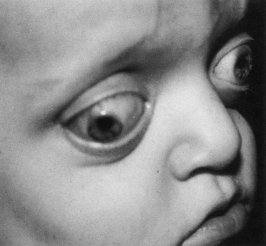 Fibrous dysplasia is not a true neoplasm; however, there is a small incidence of malignant degeneration, usually into osteogenic sarcoma. Treatment options range from careful observation to aggressive debulking of the diseased bone, with subsequent reconstruction. Recent advances in craniofacial surgery, including cranial bone grafting with mini- and microplate fixation, have made the latter approach more appealing. ANENCEPHALY Anencephaly, either partial or total absence of the brain, is a severe congenital birth defect incompatible with life. This dramatic deformity results from a failure of forebrain development. The vault of the skull is absent, and the forebrain consists of a degenerated mass of glial tissue. The orbits are shallow and tilted upward. The eyes are fairly well developed, but the optic nerves, when present, taper down to a loose mass of glial tissue at the optic canal. CYCLOPIA/SYNOPHTHALMOS True cyclopia is a rare congenital anomaly characterized by a single eye situated in a single median orbit. Synophthalmos, which is also rare but much more common than true cyclopia, occurs when paired ocular structures are found in a single median orbit (Fig. 19). These disorders result from a failure of lateralization of the midline facial structures. |