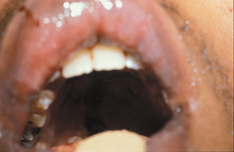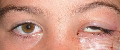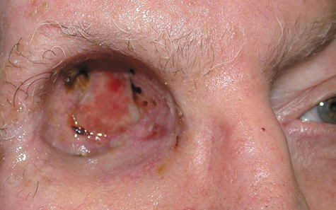 Rarely, the etiology of the eyelid infection may be diagnosed clinically. Necrotizing eyelid cellulitis may be caused by erysipelas, an infection with a group A β-hemolytic Streptococcus, and can give rise to lid necrosis (Fig. 7).44,45 H. influenzae produces a characteristic nonsuppurative preseptal cellulitis with a purplish discoloration of the eyelids.46 Staphylococcal species may cause a suppurative cellulitis with abscess formation.