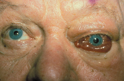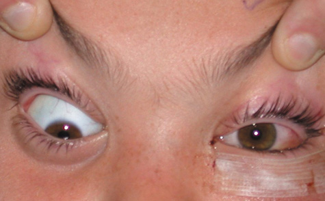 Fig. 14. Acute-onset proptosis in 12-year-old child caused by pseudocellulitis resulting from rhabdomyosarcoma.