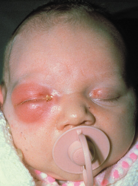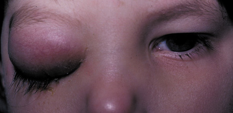 Fig. 3. Neonatal dacryocystitis. Untreated lacrimal sac infection may result in orbital cellulitis. In addition to antibiotics, probing and irrigation are required.