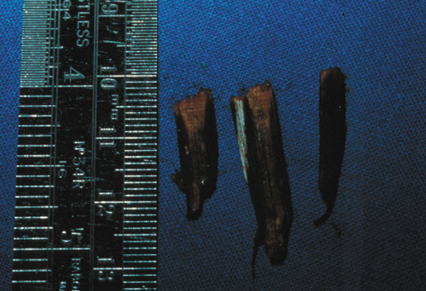 Fig. 5. A. Orbital cellulitis from a foreign body in a 45-year-old patient who 4 days earlier fell off a ladder and sustained a right nasal laceration. The cellulitis was treated with intravenous antibiotics with no improvement. All imaging scans were negative. B. At surgery, these wooden foreign bodies were removed from the right orbit.