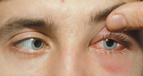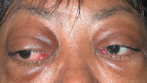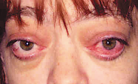 Conditions that may masquerade as preseptal cellulitis include allergic edema of the eyelids, severe blepharoconjunctivitis, dacryoadenitis (Fig. 10), trauma, thyroid eye disease (Fig. 11), leukemic infiltrates,49 blepharochalasis syndrome, and autoimmune inflammatory disorders such as lupus.
