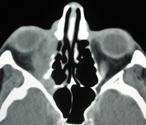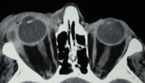 Fig. 15. Computed tomography showing preseptal cellulitis of left eye. Note that all swelling is anterior to the orbital septum.
