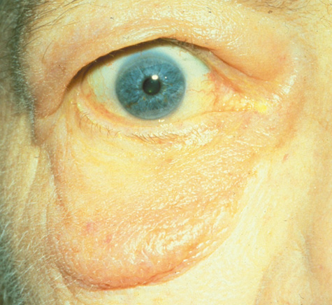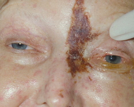 Fig. 7. A. Orbital cellulitis in 58-year-old patient secondary to Group B Streptococcus with no previous history of eyelid trauma. Exfoliation, crusting, and necrosis of skin can be seen.