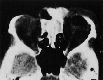 Fig. 12. A. Idiopathic inflammatory orbital pseudotumor. Note chemosis and limitation of abduction. There was no evidence of anterior cellulitis. B. Computed tomography demonstrates enlargement of right medial rectus muscle.