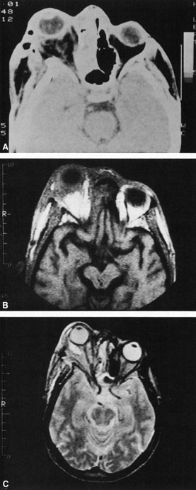 Fig. 18. Orbital abscess. A. Computed tomography of an orbital abscess presenting as an enhancing intraconal mass on right side. B. T1-weighted image. C. T2-weighted image. Note area of high signal corresponding to abscess.