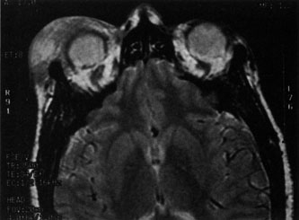 MRI may be helpful in distinguishing orbital inflammatory diseases such as orbital pseudotumor from orbital cellulitis.73 MRI is most helpful in distinguishing the diffuse orbital form of orbital pseudotumor as well as the localized inflammatory pseudotumors such as the myositis, periscleritis, and scleritis forms. The diffuse orbital form is most commonly seen on MRI as a reticular pattern with isointense signals in the orbital fat in both T1- and T2-weighted studies.73 Orbital cellulitis is best characterized by a diffuse pattern that is isointense in T1-weighted images and hyperintense on T2-weighted images.73