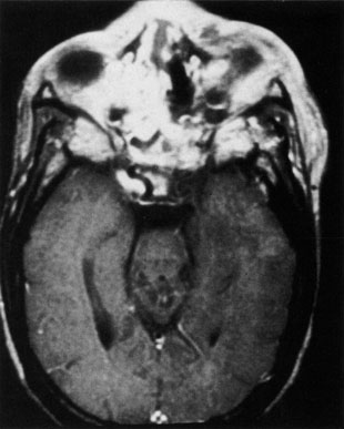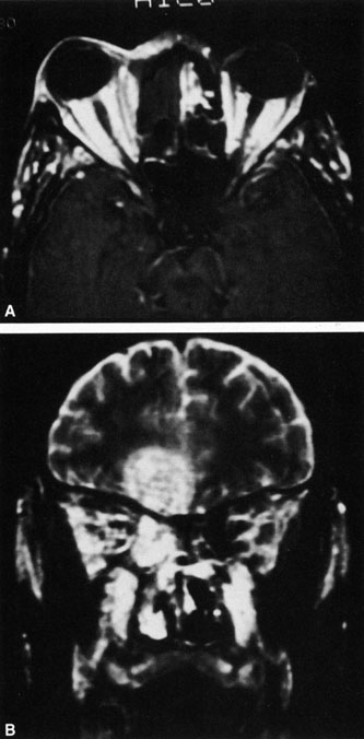 MRI is superior to CT in the diagnosis of cavernous sinus thrombosis. T2- and proton-weighted images show high signal luminal narrowing as well as absent flow or localized parenchymal infarcts (Fig. 20).72 Absent flow can be demonstrated as well in the superior ophthalmic vein in cases of carotid or cavernous sinus thrombosis.72 MRI with gadolinium can help define these abnormalities and can detect dural invasion.