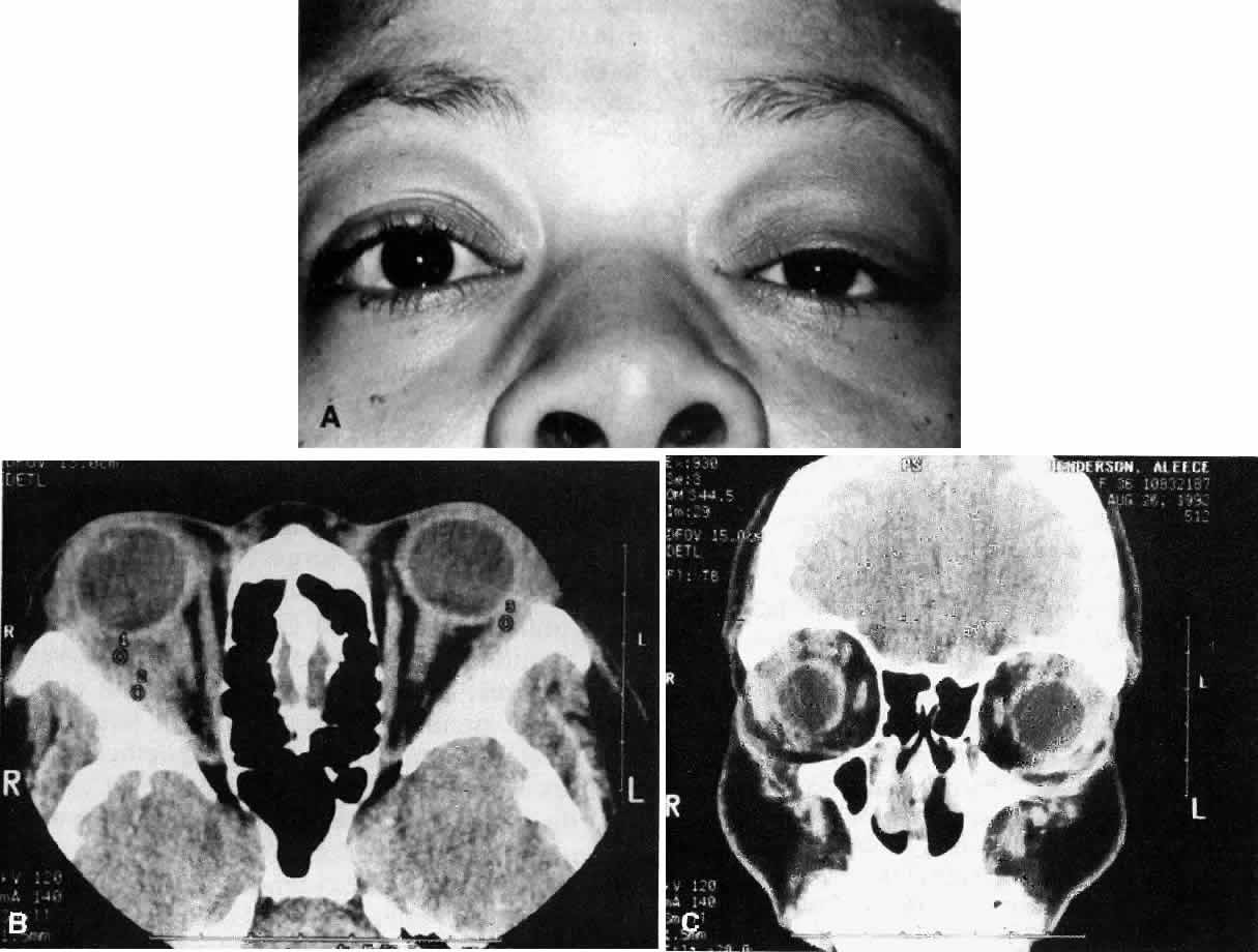 Fig. 1. A. A 36-year-old woman presented with right-sided pain and proptosis occurring over a several-day period. Externally the eye is quiet and does not appear inflamed. The patient had no complaints of diplopia or other visual disturbances. Tissue obtained at biopsy demonstrated idiopathic orbital inflammation. B. Axial CT image from the same patient demonstrates bilateral orbital masses located laterally in the orbits. Note that masses are ill defined and do not appear to have a capsule. The masses are molded to the bony orbital walls without evidence of any bony irregularities. C. Coronal CT image from the patient again shows the presence of bilateral orbital masses apparently involving the lateral rectus muscles.