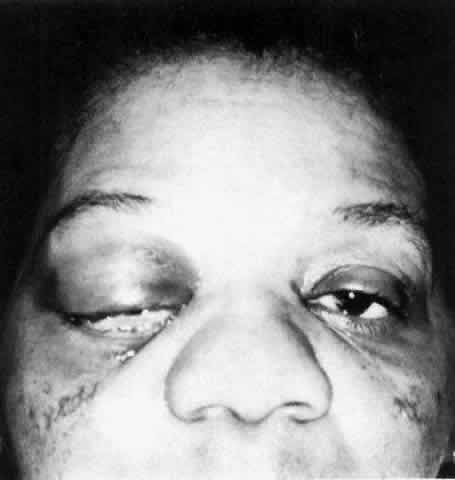 Fig. 2. A 54-year-old woman presented with acute orbital inflammation demonstrating significant proptosis and inflammatory signs involving the right orbit. In addition to severe pain, the patient had diplopia secondary to orbital edema and inflammation.