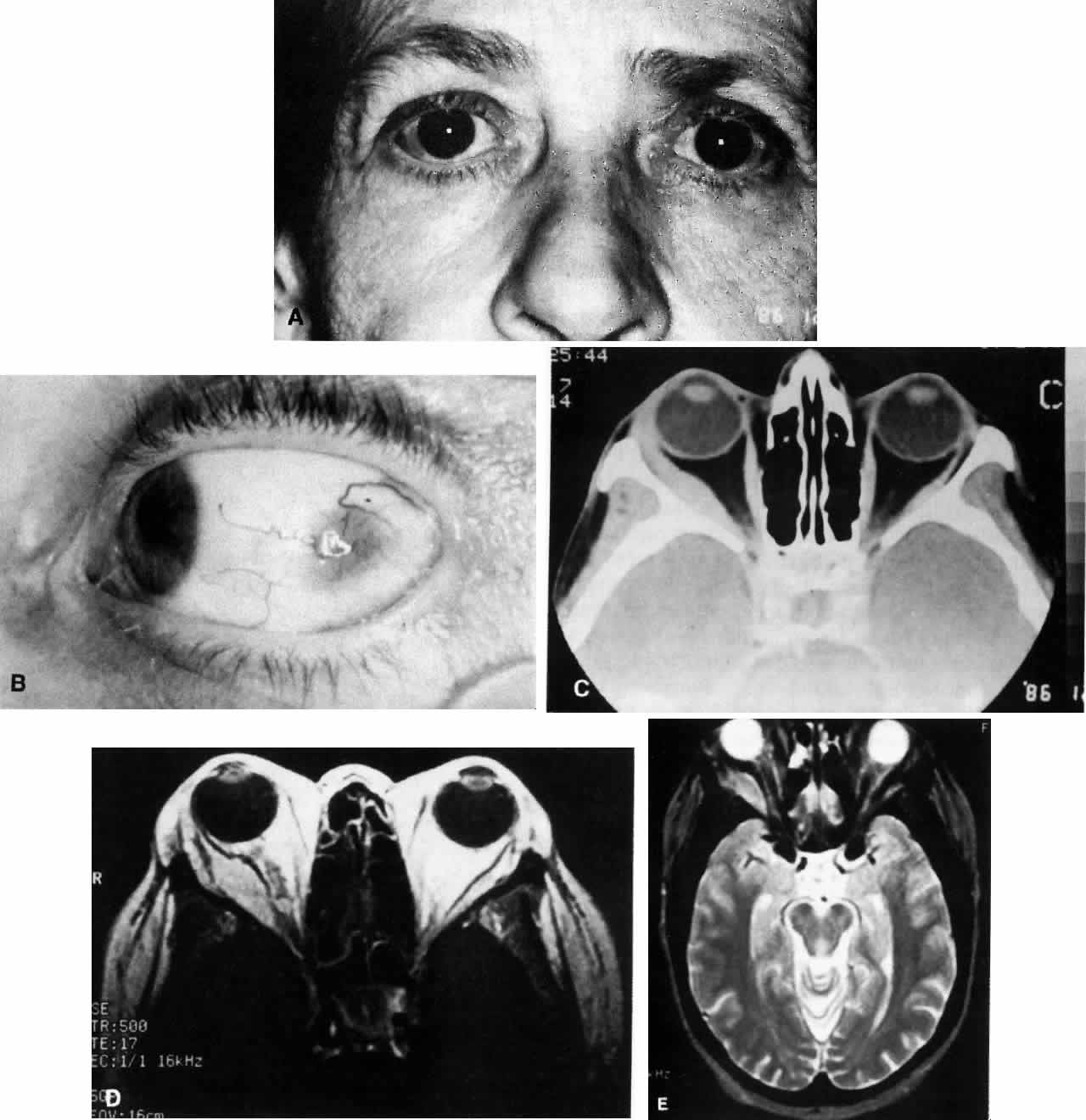 ORBITAL APEX AND SUPERIOR ORBITAL FISSURE INFLAMMATORY SYNDROME. Idiopathic inflammation involving the orbital apex is associated with marked restriction of ocular motility as well as pain and minimal proptosis.18,22,43–47 The pain is present behind the globe and is boring and persistent. There is often little evidence of obvious inflammatory signs such as eyelid edema, chemosis, and conjunctival injection. Decreased vision and an afferent pupillary defect are frequently present due either to the presence of perineuritis or to compression of the nerve by the surrounding edema. Computed tomography (CT) of the orbit will demonstrate a diffuse inflammatory process in the posterior orbit with extension into the adjacent orbital fat. The inflammation may be noted to extend forward along the optic nerve and extraocular muscles or posteriorly through the superior orbital fissure.3,20