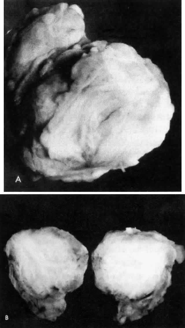 Fig. 4. A and B. Gross specimen of old, burned out, involuted granuloma from a patient with idiopathic orbital inflammation. Note lack of vascularity.