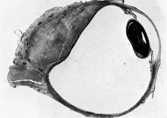 Fig. 5. Section from globe removed (in era before corticosteroid therapy) because inflammatory process had progressed inexorably to dense scar formation with resultant painful eye. Note dense ligneous tissue above globe has fused with sclera (H&E, ×4).