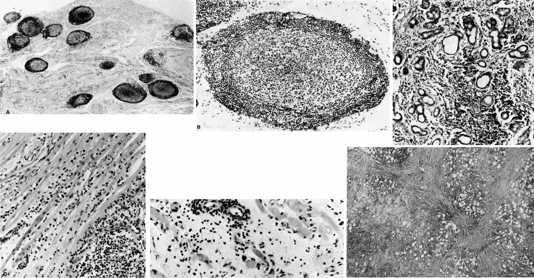 Fig. 6. Histopathologic sections demonstrating the various pathologic findings associated with idiopathic orbital inflammation. Most commonly these include lymphoid follicles, granulomas, collagen deposition, and a diffuse mixed inflammatory cell infiltrate. The normal tissue architecture is frequently disrupted by these changes. A. Many lymphoid follicles are scattered throughout orbital tissue (H&E, × 63). B. Cells of follicular center are lighter and larger than mantle of mature lymphocytes that surround the germinal zone (H&E, ×160). C. Lacrimal gland elements have undergone atrophy in advanced example of idiopathic dacryoadenitis. Fibrosis and lymphocytes have replaced a considerable amount of gland parenchyma (H&E, ×94). D. Myositis in which lymphocytes are loosely aggregated below center and infiltrate between extraocular muscle fibers (H&E, ×160). E. Cuffing of small vessels by mature lymphocytes. Note loose edematous interstitium between disrupted muscle fibers (H&E, ×240). F. Progressive fibrosis of retrobulbar fat (H&E, ×25).