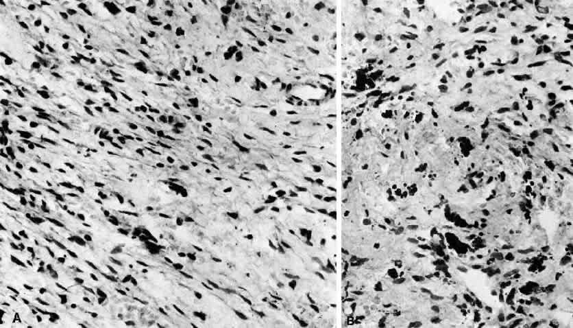 Fig. 7. Fasciitis. A. “Pseudosarcomatous” reactive inflammatory condition is composed predominantly of a loose arrangement of fibroblasts with scattered chronic inflammatory cells (H&E, ×240). B. Conspicuous hemosiderin-laden macrophages are seen in center of photomicrograph. The presence of abundant numbers of capillaries in the inflammatory tissue results in hemorrhage and the presence of blood breakdown products (H&E, ×240).