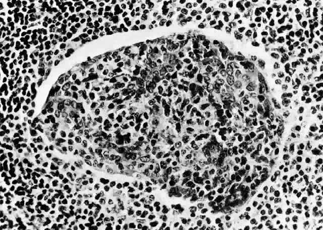 Lacrimal gland enlargement in the absence of systemic disease without dry eye symptomatology has been termed benign lymphoepithelial lesion.3,107 Previously this entity was known as Mikulicz's syndrome or disease. However, due to confusion as to the exact definition of these terms, they have been abandoned. Histologically this condition is characterized by sheets of lymphocytes and plasma cells that replace the normal acinar and ductular structure of the gland (Fig. 8). Lymphoid follicles may be present. The remaining ductular elements may proliferate to form solid nests of cells outlined by excessive basement membrane production. Hyalinization may sometimes occur within these ductular remains. The cells within these nests are for the most part epithelial elements of the ducts. These structures are commonly called myoepithelial islands because of the incorrect belief that normal ducts have myoepithelial cells present in their wall. This has been disproved on electron microscopic evaluation.108 On superficial examination these formations may resemble lymphoid follicles. The presence of these ductular nests helps to differentiate this disorder from lymphomatous involvement of the gland, which is not associated with these structures. From one third to one half of patients with Sjögren's syndrome may have similar nests of ductular elements. The difference between benign lymphoepithelial lesion and idiopathic orbital inflammation (inflammatory “pseudotumor”) involving the lacrimal gland is based on the more monomorphic infiltrate seen in benign lymphoepithelial lesion in contrast to the relatively more polymorphic infiltrate seen in “pseudotumor.” In addition, “pseudotumor” contains more plasma cells and fibrotic tissue and is associated with lymphoid follicles with active germinal centers. Finally, the lacrimal gland capsule is usually preserved in benign lymphoepithelial lesion in contrast to inflammatory “pseudotumor,” which is a more destructive process.