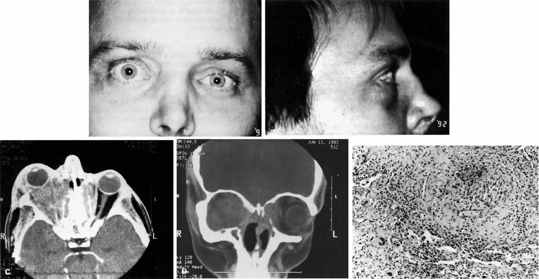 Chronic inflammatory orbital disease is usually not associated with significant symptomatology early in its course although, over the course of the disease process, proptosis, extraocular motility disturbances, and edema of the eyelids and conjunctiva will occur.3–7 Pain is not usually a feature of chronic inflammation but may occur in sclerosing forms of orbital inflammation. Underlying these findings is a chronic infiltration of the orbital tissues or simply a slowly progressive mass effect. Sarcoidosis, lymphoproliferative and neoplastic processes, thyroid-related orbitopathy, collagen vascular disease, amyloidosis, and reactive granulomatous processes (e.g., cholesterol granuloma and ruptured dermoid cyst) should all be considered in the differential diagnosis.