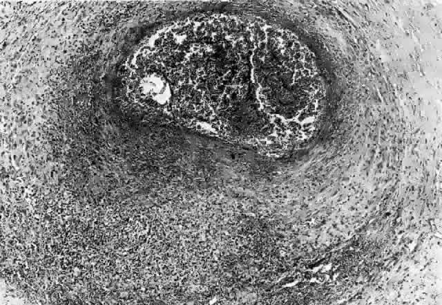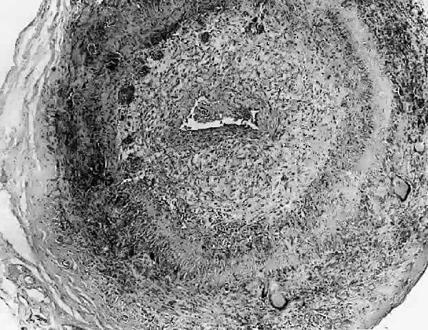 As in orbital angiitis, microscopic evaluation of tissue from orbital thrombophlebitis demonstrates an inflammatory reaction centered around blood vessels, in this case the orbital veins. This inflammation is segmental and may be associated with thrombosis. The walls of these veins may show evidence of infiltration with both neutrophils and lymphocytes without any granulomatous inflammation. As the inflammation subsides, fibrous tissue replaces the smooth muscle in the vessel walls.3 This fibrosis may extend into the surrounding orbital fat.