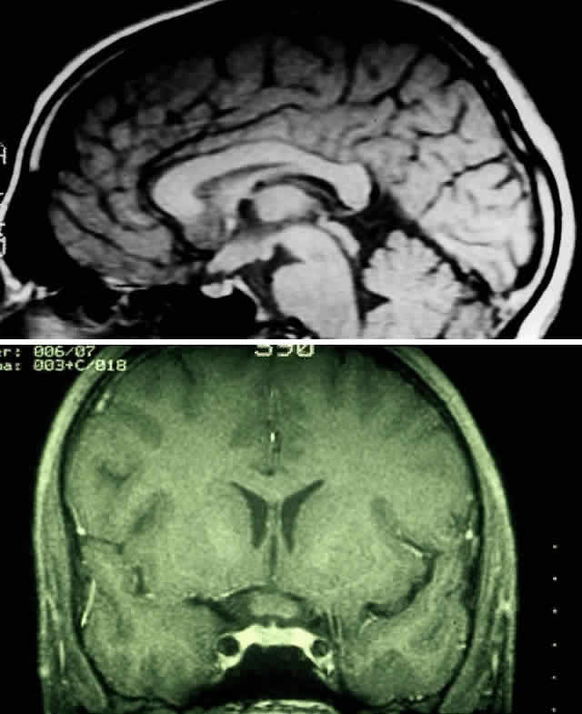 As a consequence of asymmetric or unilateral visual loss, sensory-induced strabismus may develop.18,28 Gliomas interfere with ocular motility by causing direct mechanical restriction4 and paralytic strabismus. Damage to the ocular motor nerves may occur directly by invasion of the tumor at the orbital apex, or secondarily by raising intracranial pressure. Vertical, horizontal, rotary, and see-saw nystagmus has been reported, and may even precede visual loss as an initial sign of a glioma. Consequently, children with spasmus nutans or monocular or asymmetric nystagmus may need neuroimaging and careful follow-up in order to exclude a chiasmal glioma.43–47 Patients with chiasmatic and hypothalamic involvement may develop endocrinologic manifestations, including diabetes insipidus, panhypopituitarism, girdle-type obesity, and dwarfism.48 If hypothalamopituitary function is impaired, children may exhibit a precocious puberty in association with growth hormone deficiency.49,50 Depending on the extent of the glioma in the hypothalamic region, neurologic manifestations can include epilepsy, hemiparesis, and the diencephalic syndrome. With obstruction of the third ventricle or foramen of Monro, hydrocephalus may occur with manifestations of lethargy, headache, and vomiting. |