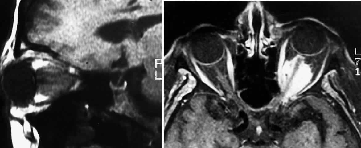 Globular tumors in the suprasellar area that lack these features usually require craniotomy and biopsy confirmation. Lesions that may be difficult to distinguish from optic pathway gliomas include germinomas of the visual system and optic nerve choristoma because they both may appear intrinsic to the visual pathway.13 Tumors such as craniopharyngiomas and pituitary adenomas usually do not appear intrinsic to the visual pathway and may have features of sellar enlargement. Findings such as enhancement of the leptomeninges or peripheral enhancement of an enlarged chiasm are atypical of optic glioma and may indicate an inflammatory process masquerading as a glioma.83 Aneurysms in the suprasellar area may sometimes appear on neuroimaging to be intrinsic to the visual pathway. Better definition may be noted with magnetic resonance angiography.13 In contrast to orbital optic nerve gliomas, meningiomas enhance strongly with gadolinium and are less common in children. Meningiomas have the following features on axial CT scanning that are not typically shared by optic nerve gliomas:
