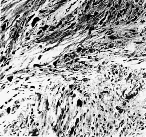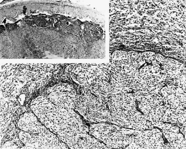 There have been exceptions to this patient profile, with rare reports of malignant optic gliomas pre-senting in both children135,136 and the elderly.137 In two thirds of reported cases of malignant optic gliomas, the patients have been male.3 Monocular blurring of vision and periorbital pain are common early symptoms of malignant optic nerve glioma. The disc may be edematous, mildly atrophic, or initially normal in appearance. The etiology of the visual loss is frequently misdiagnosed and often initially considered to be optic neuritis, anterior ischemic optic neuropathy, or posterior ischemic optic neuropathy. With subpial tumor growth and subsequent venous obstruction,134,138 an appearance consistent with venous stasis retinopathy or central vein occlusion may result.134,139,140 Neovascular glaucoma can occur.71 Although an initial presentation consisting of subjective monocular loss of vision has been considered characteristic,134,141–143 bilateral symptoms have been described in more than one half of cases in which clinical details were given.3 More than one half of patients will have an initial visual acuity worse or equal to counting fingers in the more affected eye.3 In patients presenting with unilateral visual loss, the fellow eye typically becomes involved several weeks later, with visual impairment rapidly progressing to blindness.134 Another clinical feature of malignant optic nerve glioma is mild proptosis secondary to spread of the tumor into the orbital tissues.134 Ophthalmoplegia may be attributed to mechanical factors from tumor extension or from isolated cranial nerve involvement. Tumor invasion of surrounding neurologic structures may result in hydrocephalus, hypothalamic dysfunction, hemiplegia, or seizures.144 Because of the invasive nature of this tumor, it is difficult to establish the tissue site of origin. As symptoms tend to originate in the optic nerve, it is likely that the malignant optic glioma is a primary optic neoplasm.145 Gross pathology reveals a necrotic tumor causing thickening of the optic nerves, optic chiasm, and optic tracts.137 Posterior extension into the hypothalamus, third ventricle, basal ganglia, midbrain, and temporal lobe may be observed.137,145 The tumor has been characterized as malignant astrocytoma or glioblastoma multiforme. Microscopic features include pleomorphic and mitotically active fibrillary astrocytes.141 Giant hyperchromatic nuclei can be present and occasionally appear to be multilobulated. Additional histopathologic features include radial aggregation around blood vessels with endothelial cell proliferation134 and Rosenthal fibers.141 The tumor cells can invade both the arachnoid and dural sheaths as well as adjacent tissue structures. Tumor necrosis and hemorrhages may result from perivascular tumor growth.144 In the past, the diagnosis of malignant glioma often was made only after surgical exploration.140 CT scanning has since facilitated visualization of an abnormality of the chiasm and nerves, but the radiographic appearance of a malignant glioma can range from a thickened appearance of the optic pathways71 to a mass resembling a craniopharyngioma or cystic pituitary adenoma.146 Further characterization of malignant gliomas by MRI may eventually allow an earlier diagnosis. Despite the use of both radiotherapy and chemotherapy modalities, the prognosis of a malignant glioma of the visual pathway remains dismal: the mean survival after diagnosis is only 8.7 months.3 Radiotherapy and combined radiation and chemotherapy have been used with little success.134,139,141 Although dramatic tumor shrinkage and minimal improvement of visual function have occurred with aggressive treatment protocols,139,141 the typical clinical course of visual loss and death is ultimately unchanged in the majority of cases. It should be noted, however, that Albers and co-workers139 did report on a patient with biopsy-proven malignant glioma treated with 60 Gy and aggressive chemotherapy who continued to function well 1½ years after diagnosis. |