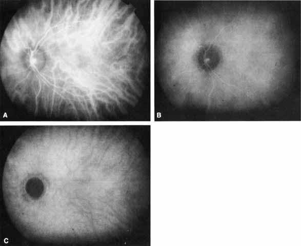 Fig. 1 Normal Indocyanine Green (ICG) angiogram. A. Early phase photograph (90 seconds after dye injection) shows the hyperfluorescent choroidal and retinal vessels. B. Middle-phase photograph (10 minutes after dye injection) reveals more homogeneous background choroidal fluorescence with relative attenuation of the retinal vascular fluorescence. C. Late-phase photograph (30 minutes after dye injection) shows medium-sized choroidal vessels in relief (relative hypofluorescence). No retinal structures are visible.