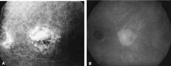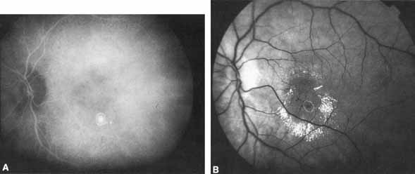 Fig. 4 A. Arteriovenous phase fluorescein angiogram taken from a patient with macular degeneration shows leakage in the central macula along with surrounding ill-defined, speckled hyperfluorescence. B. The corresponding late-phase (25-minute) ICG angiogram demonstrates a well-defined, plaque-like area of relative hyperfluorescence. (Courtesy of Dr. W. Annesley)