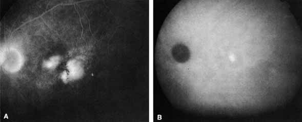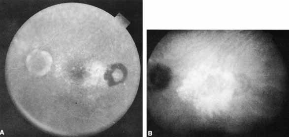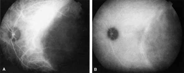 Fig. 14 ICGA of a dome-shaped choroidal metastasis located in the temporal macular area. Both early phase (A) and middle-phase (B) photographs show relative hypofluorescence without angiographically apparent lesional vascularity. (Courtesy of Dr. J. Shields)