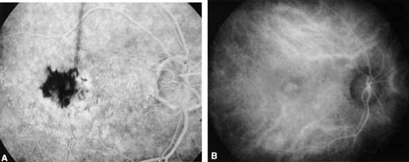 Fig. 5 A. Ill-defined late leakage and mottled hyperfluorescence along with blockage of fluorescence from subretinal hemorrhage is evident temporal to the foveal center in this fluorescein angiogram of a patient with macular degeneration. B. The corresponding late-phase (22-minute) ICG angiogram shows a bright, well-delineated hyperfluorescent vascular-like structure in the central macula. (Courtesy of Dr. W. Benson)