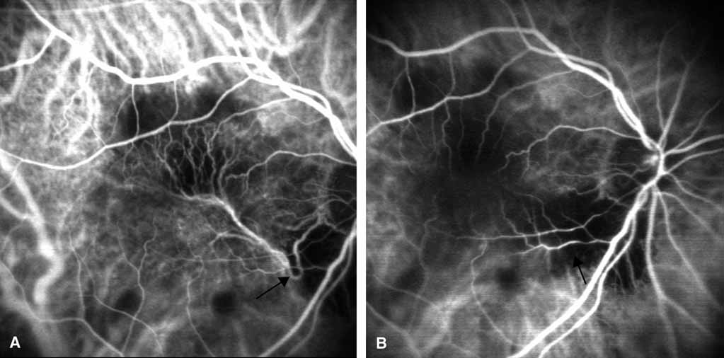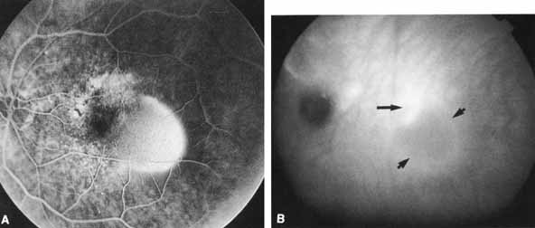 Fig. 11 A. Pretreatment scanning laser ophthalmoscope high-speed indocyanine green angiography showing a well-delineated choroidal “feeder” (arrow) vessel supplying a large subfoveal neovascular complex. B. Posttreatment SLO-ICGA with laser photocoagulation applied to the feeder only (arrow) shows a lack of blood flow through the entire neovascular complex.