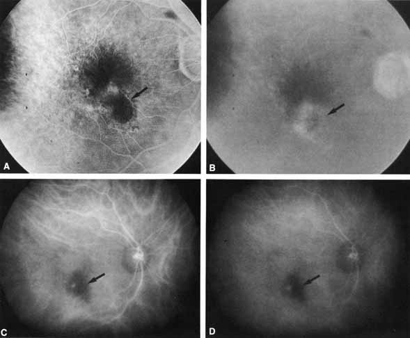 Fig. 8 Early phase (A) and late-phase (B) fluorescein angiograms taken 2 weeks after laser photocoagulation of a choroidal neovascular focus in a patient with macular degeneration. There is ill-defined leakage (hyperfluorescence) along the temporal and superior aspect of the photocoagulation mark (arrow). Both early phase (C) and middle-phase (D) ICG angiograms demonstrate a small, well-defined focus of relative hyperfluorescence standing out in contrast at the margin of the hypofluorescent photocoagulation mark (arrow). Retreatment with laser photocoagulation directed at this hyperfluorescent spot alone resulted in rapid resolution of exudation.