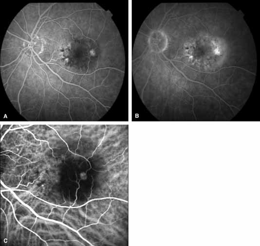 Fig. 10 A. Early phase fluorescein angiogram shows a focal area of hyperfluorescence in the temporal macula. B. Late-phase fluorescein angiogram demonstrates diffuse, stippled hyperfluorescence consistent with occult neovascularization. C. SLO-based ICG demonstrates a “hot spot” with retinal vascular communication consistent with RAP.