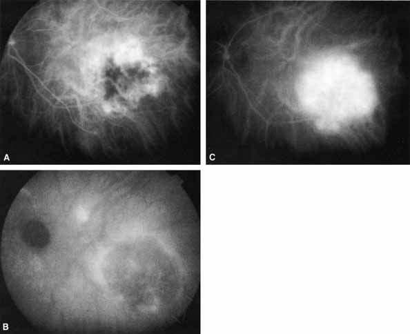 Fig. 13 ICGA of a well-circumscribed choroidal hemangioma located in the inferotemporal macular region. A. An early phase photograph taken 40 seconds after injection of dye shows irregular, lacy hyperfluorescence. B. A photograph taken 3 minutes into the angiogram shows more diffuse, bright lesional hyperfluorescence, which nearly completely fades by the late phase (C), with the lesion becoming mostly hypofluorescent. (Courtesy of Dr. C. Shields)