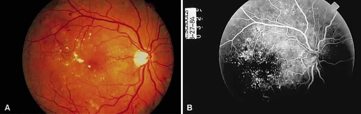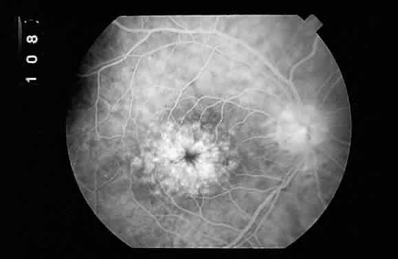 When an exudate is present in a ring configuration outside of the macula, the vascular disease is most commonly found within the ring. Retinal macroaneurysm is an example (Fig. 45) of a focal retinal vascular lesion surrounded frequently by exudate.